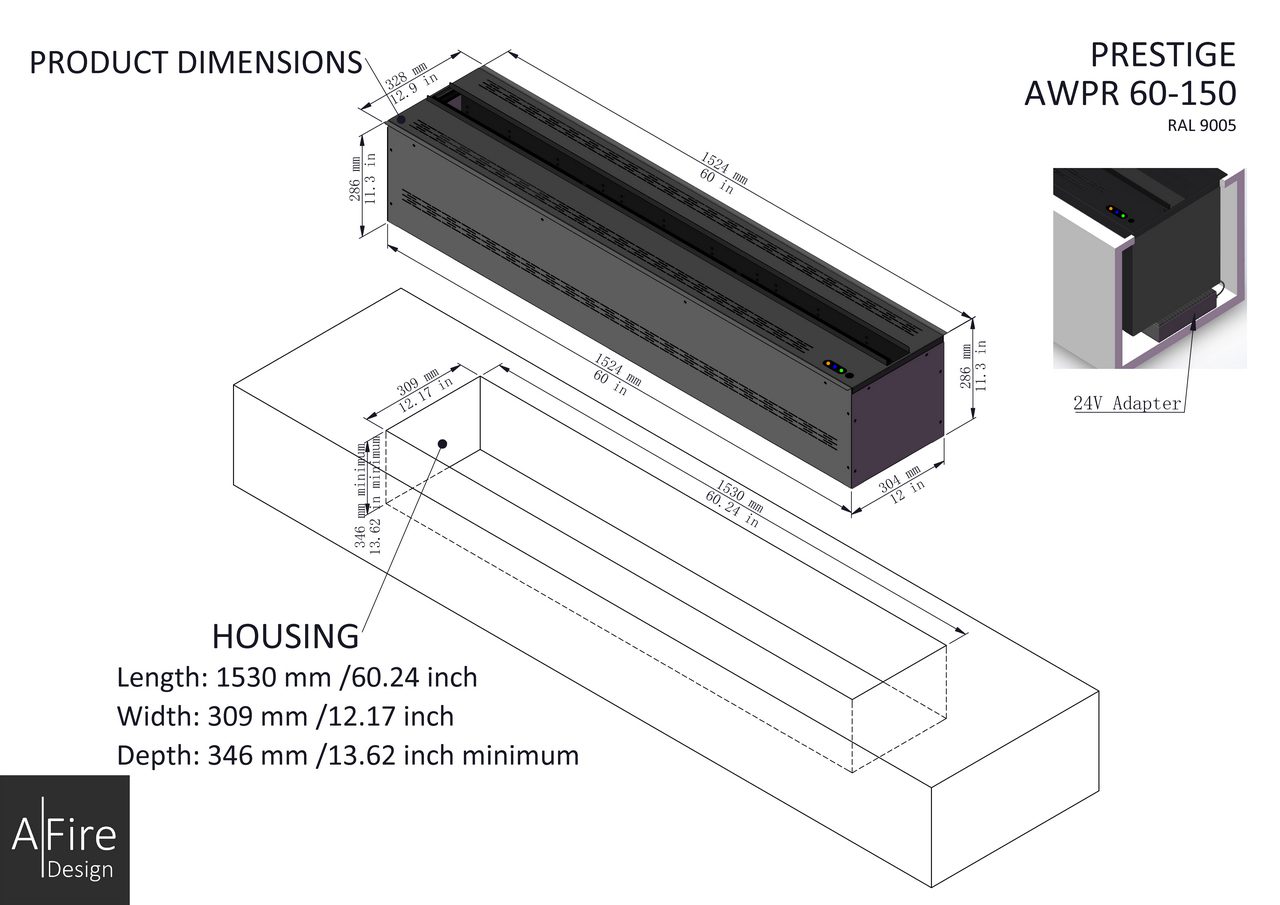 La Cheminée à vapeur d’eau PRESTIGE 150 cm à flammes naturelles et multicolores AWPR 60-150 AFIRE™ offre des flammes froides 3D spectaculaires, des couleurs personnalisables et un contrôle intuitif via une application pour Smartphone, télécommande, etc.